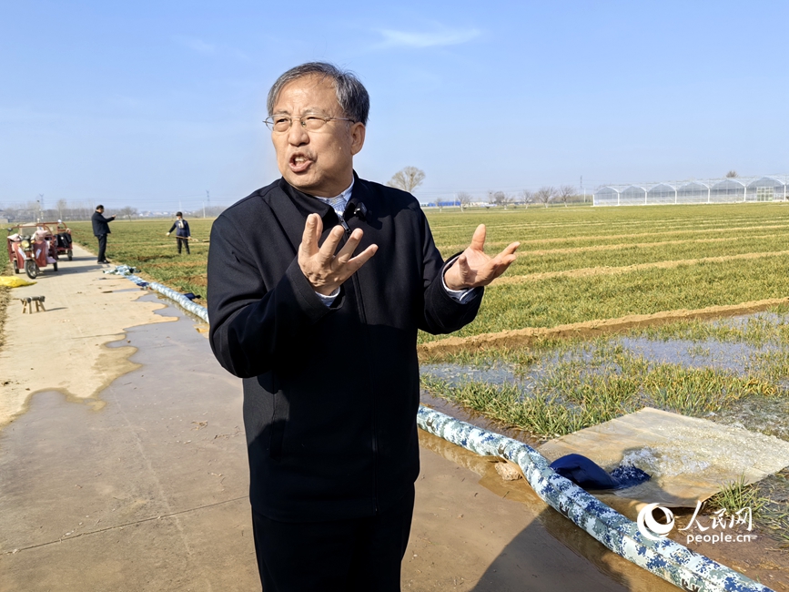 2月27日,正在河南省新乡县朗公庙镇崔庄村的地头,全国代表、河南科技学院小麦研究核心传授茹振钢一边细心察看麦苗发展环境,一边耐心地给村平易近李安明春季田间办理的要点。